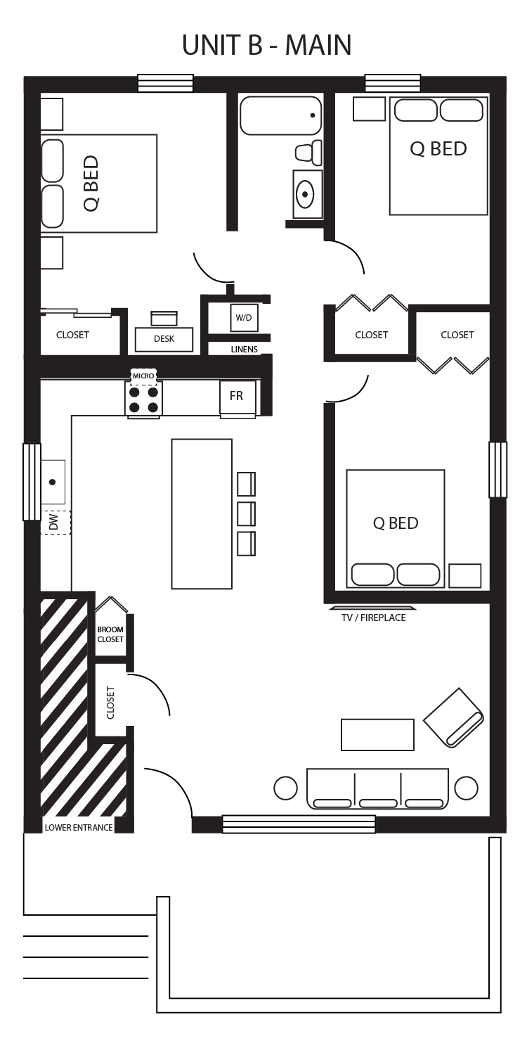 Furnished all-inclusive 3 bedrooms – queen beds, 1 full bath.